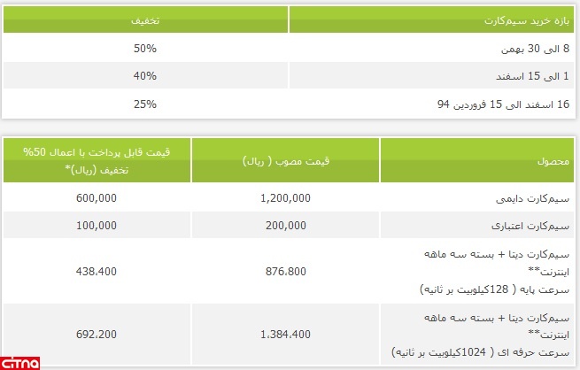 در این طرح، محصولات زیر با تخفیفهای پلکانی ارایه میشوند؛ بدین معنی که با توجه به زمان خرید، درصد بهرهمندی از تخفیف متفاوت خواهد بود و متقاضیانی که زودتر به خرید سیمکارت اقدام نمایند، تخفیف بیشتری دریافت می نمایند.