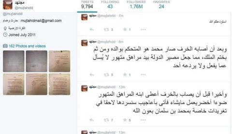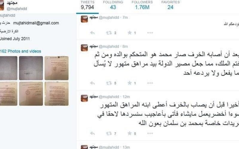فعال عربستانی که به دلیل انتشار خبرهایی از مسائل پشت پرده خاندان حاکم در این کشور، شهرت بسیاری را کسب کرده، مطالب تازهای را درباره پادشاه این کشور و فرزندش فاش کرد.