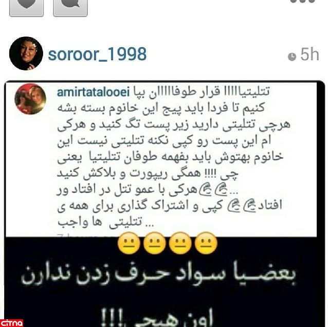 اینم پیام طرفدارای دوستتون به پیروی از ایشون ،که من اولین نفری بودم که با نهایت انسانیت ازش دفاع کردم.می تونید در پست های چهار ماه قبل من ببینید.طرفدارای نه فقط من بلکه همه هنرمندان از واقعی هم واقعی تر هستن و با شیطنت چند تا نوجوون درست مثل جاسازی کردن مواد در ماشین کسی برای پاپوش درست کردن چهره کسی تخریب نمیشه. .من هیچی ندارم..اما قدرت فراوانی دارم برای بخشیدن..ولی یکبار برای همیشه این موضوع تهمت و توهین به هنرمندان رو تموم میکنم و از همه حمایت میخوام..چندروزه دارن فحش ناموسی میدن به ناموس مردم..چه گناه سنگینی به دوش شماست..به خداوندی خدا من اون بیرون زندگی واقعی دارم..هشتاد میلیون نفر انسان. احتیاجی به این کارا نداشتم و ندارم.تمرکزم هرگز روی این بحث های بچه گانه نبوده ونیست. .سلامتی و آرامش خانوادم مهمترین چیزه..اما گناهکاران را به خدا و قانون واگذار میکنم...و شب عیدی همه شمارو میبخشم و دلم میخواد این بحث تموم بشه...در شان طرفدارای من نیست که برخورد بدو با بدی جواب بدن...واقعا دلم میخواد شماها به آرزوها تون برسید ..همانطور که منم دارم واسه رسیدن به رویاهای خودم تلاش میکنم..واقعا نمیدونم چرا چهار روزه که دارم به چه جرمی تهدید میشم...به جرم داشتن طرفدار؟؟گناه بزرگی کردید دوستان..خدا ببخشه شمارو...هر کی با ایل بختیاری در افتد،...؟در ضمن کسی که دعا هاش واقعیه به ناموس مردم توهین نمیکنه و فحش نمیده و دست به هر کاری نمی زنه.فالور فیکم والا کسی بلد نبود چیه،ما هم نمی دونستیم ،شما این کاره هستی و داری به همه یاد میدی و خوبم واردی.یا علی.