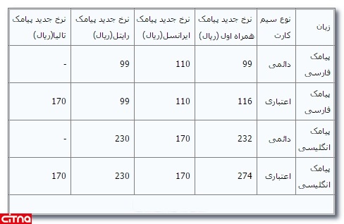 تعرفه جدید پیامکهای فارسی و انگلیسی از سوی اپراتورهای مختلف به شرح جدول زیر است: