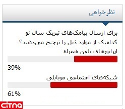 به گزارش سیتنا، به استناد جدیدترین نظرسنجی اینترنتی سیتنا با عنوان "برای ارسال پیامکهای تبریک سال نو کدامیک از موارد ذیل را ترجیح میدهید؟" 39 درصد مردم، اپراتورهای تلفن همراه و 61 درصد مردم، شبکههای اجتماعی موبایلی را برگزیدند.