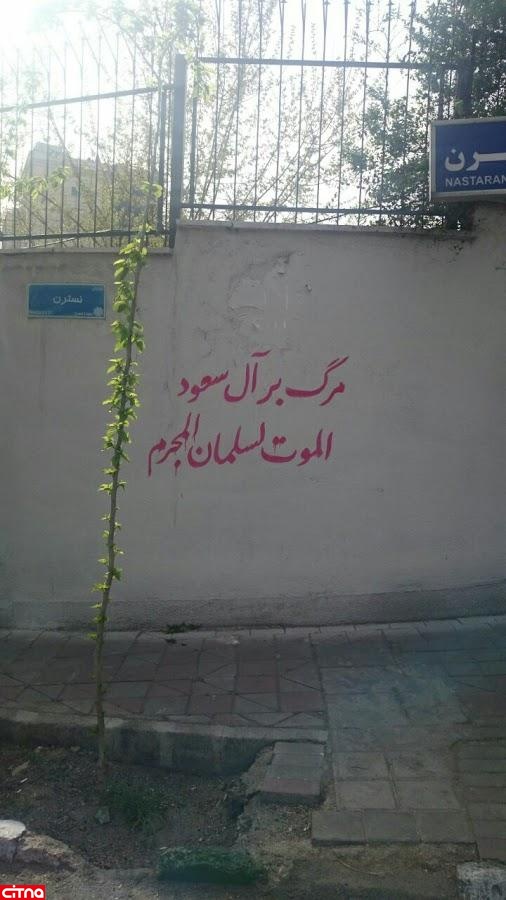 در تصاویر دیگر منتشر شده در فضای مجازی، عکسی از دیوار نویسی روی دیوار سفارت عربستان در تهران هم دیده میشود.