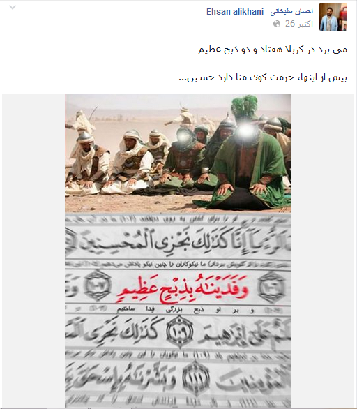 به گزارش سیتنا، احسان علیخانی نوشت:"می برد در کربلا هفتاد و دو ذبح عظیم بیش از اینها ، حرمت کوی منا دارد حسین".
