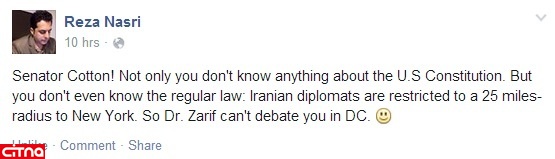 رضا نصری، حقوقدان بین المللی و عضو موسسه مطالعات عالی بین المللی ژنو در صفحه فیسبوک خود در پاسخ به اظهارات کاتن، نوشت: «سناتور کاتن! تو نه تنها چیزی درباره قانون اساسی ایالات متحده نمی دانی، بلکه حتی درباره قوانین عادی هم چیزی نمی دانی: دیپلمات های ایرانی در نیویورک به یک محدوده با شعاع 25 مایلی محدود هستند. بنابراین، دکتر ظریف نمی تواند در واشنگتن با تو مناظره کند».
