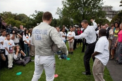 رئیس جمهور آمریکا عکسی را که وی را در حال شمشیر بازی نشان می دهد به همراه جمله‌ای منتشر کرد و این پست توسط مارک زاکربرگ هم لایک شد.