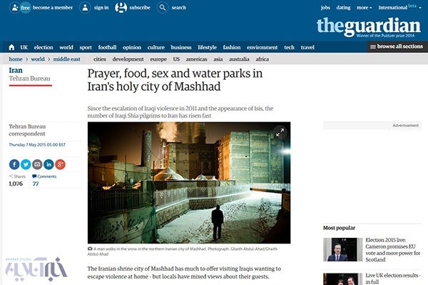 وبسایت روزنامه انگلیسی «گاردین» روز 17 اردیبهشت ماه گزارشی تکاندهنده در مورد حضور زوار عراقی در مشهد منتشر کرد با عنوان «زیارت، غذا، سکس و پارک آبی در شهر مقدس مشهد».