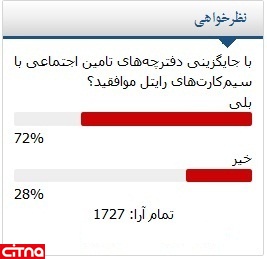 بیش از 1700 نفر از کاربران سیتنا در نظرسنجی اینترنتی این پایگاه خبری با عنوان "با جایگزینی دفترچههای تامین اجتماعی با سیمکارتهای رایتل موافقید؟" شرکت کرده و از این میان 72 درصد پاسخ مثبت و مابقی پاسخ منفی دادند.