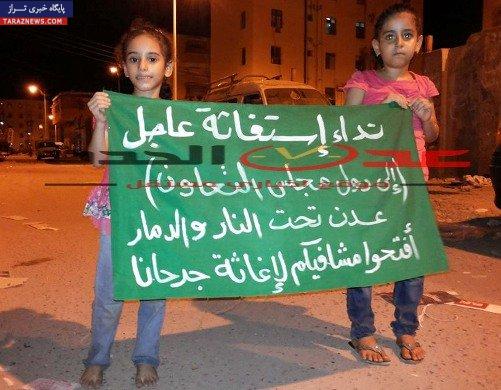 به گزارش سیتنا، در این تصویر، دو دختر کم سن و سال یمنی پلاکاردی در دست گرفته اند که بر روی آن نوشته شده: درخواست کمک فوری داریم. از کشورهای شورای همکاری خلیج (فارس).. شهر عدن زیر آتش قرار گرفته.. مراکز پزشکی خود را به روی زخمی های ما باز کنید.