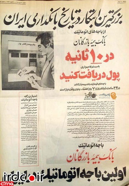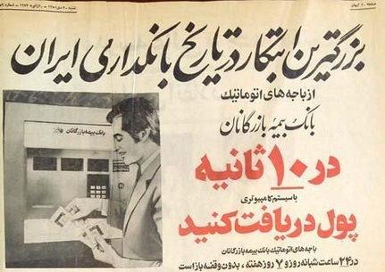 تصویر زیر مربوط به تبلیغ اولین خودپرداز در ایران است که در زمان خود «بزرگترین ابتکار در تاریخ بانکداری» محسوب میشد.