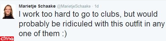 وی در صفحه توییترش نوشته: بخاطر گرفتاریهای کاری وقتی برای کلوپ رفتن ندارم اما اگر با این لباس بروم مسخرهام میکنند!