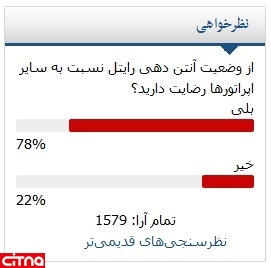 کاربران سیتنا با شرکت در نظرسنجی این پایگاه خبری به سوال "از وضعیت آنتن دهی رایتل نسبت به سایر اپراتورها رضایت دارید؟" پاسخ دادند.