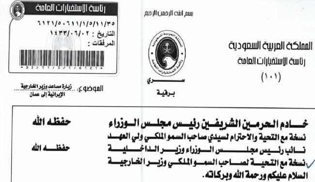 به گزارش سیتنا به نقل از شبکه العالم، این نمابر محرمانه از سوی ریاست اطلاعات عمومی عربستان یا همان سرویس امنیت و اطلاعات خارجی این کشور به مسؤولان ارشد سعودی نوشته شده است.