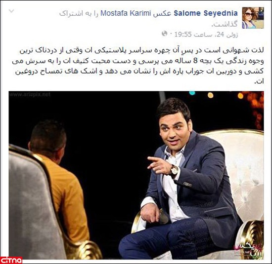 سالومه سیدنیا که اکنون کمتر از سابق نوبت آنتن در شبکه من و تو به وی می رسد در پستی در فیسبوکش با توهین به احسان علیخانی و برنامه محبوب او چنین نوشت: «لذت شهوانی است در پسِ آن چهره سراسر پلاستیکی ات وقتی از دردناک ترین وجوه زندگی یک بچه 8 ساله می پرسی و دست محبت کثیف ات را به سرش می کشی و دوربین ات جوراب پاره اش را نشان می دهد و اشک های تمساح دروغین ات.»