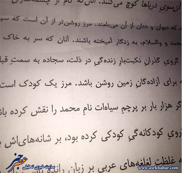 «من که جز یک فن پیج صفحه ای در فیس بوک ندارم اما شنیدم تو فیس بوک حال خیلی ها خرابه سر مقتل خونی من از بی بی سی و نادر فتوره چی بگیر تا خیلی از روشنفکر نماهای دیگه جوابم فقط به این آدما اینه زیر پرچم حسین ع سینه زدن لیاقت میخواد افتخار میکنم که از بچگی این ارادت رو داشتم و دارم جالبه که حتی مصاحبه با تلوزیون رو بخاطر همین حواشی بعد برنامه حذف کردم و انجام ندادم اما نمیدونستم هنوزم ادمای هستن که بخاطر اعتقاد مذهبی که خیلی شخصیه توهین میکنن و به اسم دموکراسی فحاشی میکنن و آنقدر وقاحت دارن که علمداری امام حسین ع رو تحجر بدونن بازم تاکید میکنم من افتخارمیکنم به خواندن مقتل حضرت رقیه در محرم سال هزار و سیصد و نود و سه شمسی و نذر کردم تا زنده ام برأی همه کودکان مظلوم در جنگ و به عنوان سفیر انجمن حمایت از حقوق کودکان مقتل حضرت رقیه رو برأی مردم بخوانم /یا حسین»