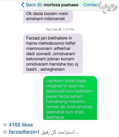 تصویر تلخ آخرین ارتباط پیامکی فرزاد فرزین با مرتضی پاشایی!