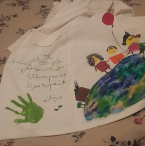 مانتویی که دوست عزیزم المیرا نوری برام طراحی کرده… وعرفان گلم کودک کار برام روش نقاشی کرده و یادگاری نوشته… داشتن یه امضا از عرفان برام افتخاره… چرا که بزرگمرد اوست… کاوه فردا اوست… بوسه میزنم به دستای عرفان و عرفانها… المیرا از خلاقیت تو ممنون… شل و پل همه کودکان کار… به امید جهانی که کودکان درآن فقط کودکی کنن و درس بخونن… یاعلی.