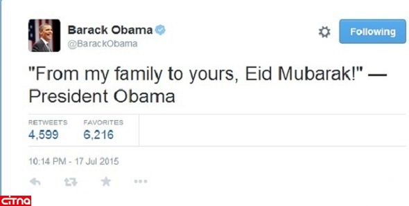 باراک اوباما رئیس جمهور آمریکا با انتشار پستی در صفحه شخصی خود در توئیتر عید فطر را از طرف خود و خانواده اش تبریک گفت.