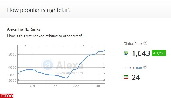 به گزارش سیتنا، بررسی رتبه سایت رایتل به آدرس www.rightel.ir در سایت رتبه بندی الکسا، رشد قابل توجه تعداد مخاطبان وب سایت این اپراتور طی ماههای اخیر، همزمان با توجه مخاطبان به طرحهای ارائه شده توسط این اپراتور در وب سایت رایتل را نشان میدهد.