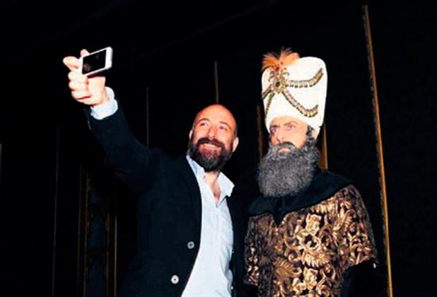 "هالیت (خالد) ارگنچ" هنرپیشه نقش سلطان سلیمان در سریال معروف "حریم سلطان" ( نام اصلی این سریال " قرن باشکوه" است) در مراسم بازگشایی گالری (موزه) سریال حریم سلطان در استانبول با مجسمه مومی شخصیت سلطان سلیمان در حال گرفتن عکس "سلفی" است.