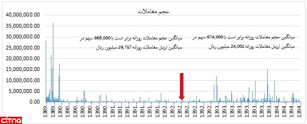 نمودار زیر روند حجم معاملات و ارزش معاملات سهام همراه اول را پیش از ورود به بورس و پس از آن نشان می دهد.