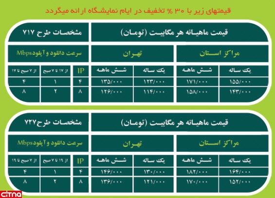 براساس این طرح شرکتها و سازمانهایی که نیازمند اینترنت پرسرعت با پهنای باند اداری اختصاصی هستند، میتوانند در روزهای برگزاری نمایشگاه، طرحهای اداری و سازمانی 717 و 727 را با 30 درصد تخفیف ویژه خریداری نمایند.