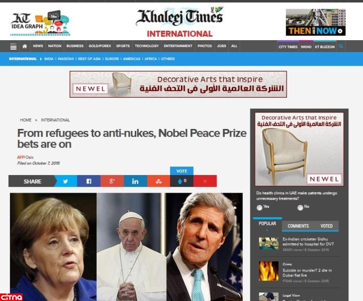 به گزارش سیتنا به نقل از جام نیوز، در حالی که محمد جواد ظریف وزیر امور خارجه کشورمان نیز به همراه آنگلا مرکل و پاپ و همتای خود یعنی وزیر امور خارجه آمریکا نامزد دریافت جایزه صلح نوبل شده است، روزنامه اماراتی خلیج تایمز در حالی به این خبر پرداخته است که خبری از عکس محمد جواد ظریف نیست.