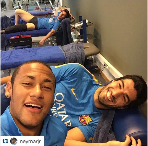 مسی که دچار مصدومیت است این روزها به ریکاوری و فیزیوتراپی مشغول است و به نظر می رسد سوارز هم دچار مصدومیت شده است. این عکس را نیمار در اینستاگرام خود منتشر کرد.