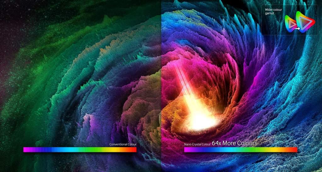 همانطور که پیشتر اشاره شد، نانو کریستال مادهای است متشکل از ذرات نانو متری که با عبور نور از آن رنگ تولید می شود. این ذرات هزاران برابر از قطر یک تار مو ریزتر هستند و به دلیل قابلیت نوردهی منحصربهفرد و تولید طیف وسیعی از رنگ در قالب یک لایه، در ساخت پنل تلویزیونهای سامسونگ به کار رفته است. استفاده از این ذرات باعث میشود تصویر نهایی که مخاطب میبیند واقعیتر و با گستره رنگی وسیعتری باشد.