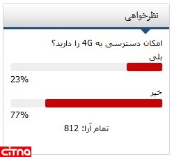 با شرکت بالغ بر 800 نفر از کاربران سیتنا در نظرسنجی اینترنتی این پایگاه خبری با عنوان "امکان دسترسی به 4G را دارید؟" 77 درصد از کاربران پاسخ خیر را انتخاب کردند.