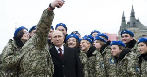 ولادیمیر پوتین رئیس جمهور روسیه در حال انداختن عکس سلفی با گروهی از نظامیان زن این کشور. منبع این عکس، رویترز است.