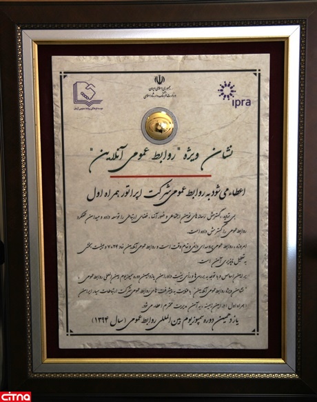 بر این اساس، با توجه به بررسی ها و رأی هیئت داوران یازدهمین دوره سمپوزیوم بین المللی روابط عمومی، نشان ویژه روابط عمومی آنلاین با عنایت به پیشرفت های روابط عمومی شرکت ارتباطات سیار ایران (همراه اول) در این زمینه، به آن مدیریت محترم اعطاء می شود».