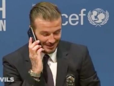 دیوید بکام در کنفرانس مطبوعاتی بازی خیریه تلفن یک خبرنگار را جواب داد.