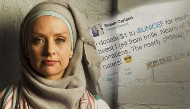 "سوزان کارلند"، استاد دانشگاه و پژوهشگر مسلمان استرالیایی، متعهد شده است به ازای هر کامنت حاوی "تنفر" یا "خشونت" که از طریق صفحه شخصی اش در پایگاه اجتماعی توئیتر یا فیس بوک دریافت می کند، یک دلار به صندوق کودکان ملل متحد (یونیسف) کمک کند.