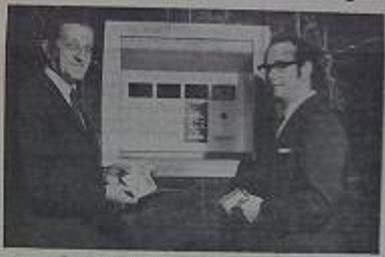 این عکس، بهمن 1351 در مراسم آغاز بکار اولین باجه اتوماتیک کامپیوتری در شعبه مرکزی بانک بیمه بازرگانان گرفته شده است.