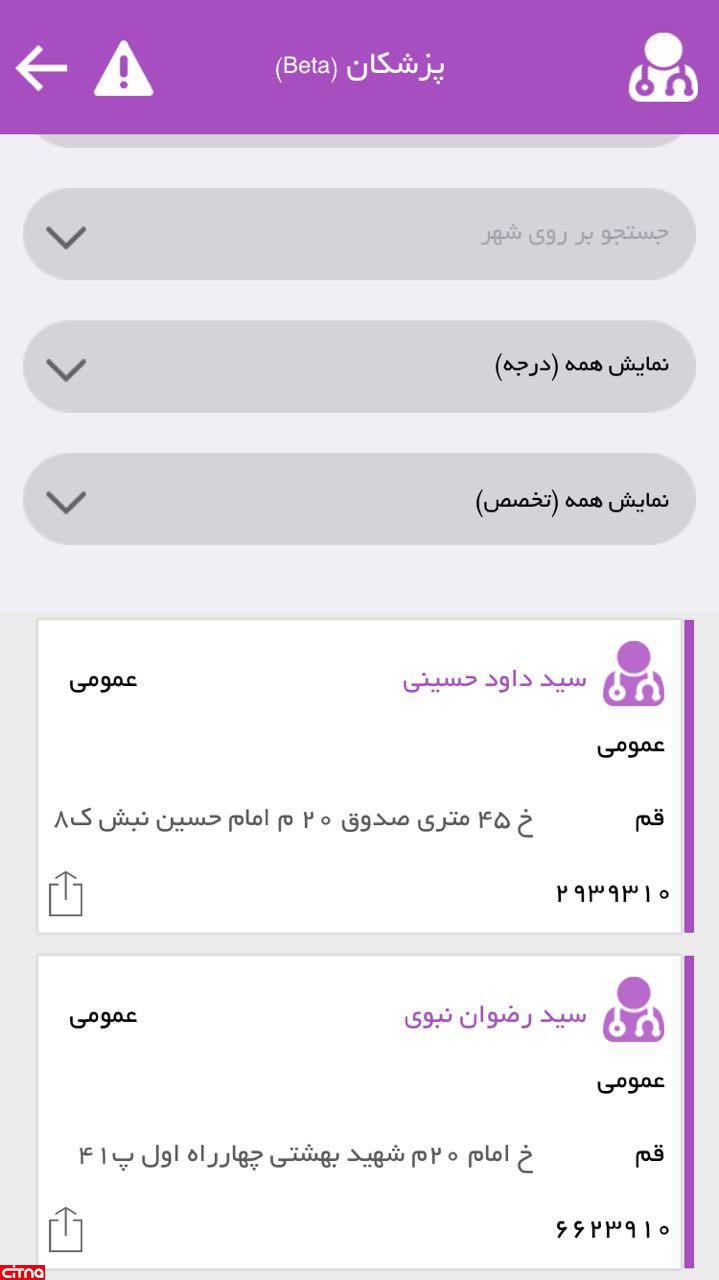 • اطلاعات 80 هزار پزشک در 300 شهر ایران و با 120 نوع تخصص با قابلیت دسته بندی و جستجو،