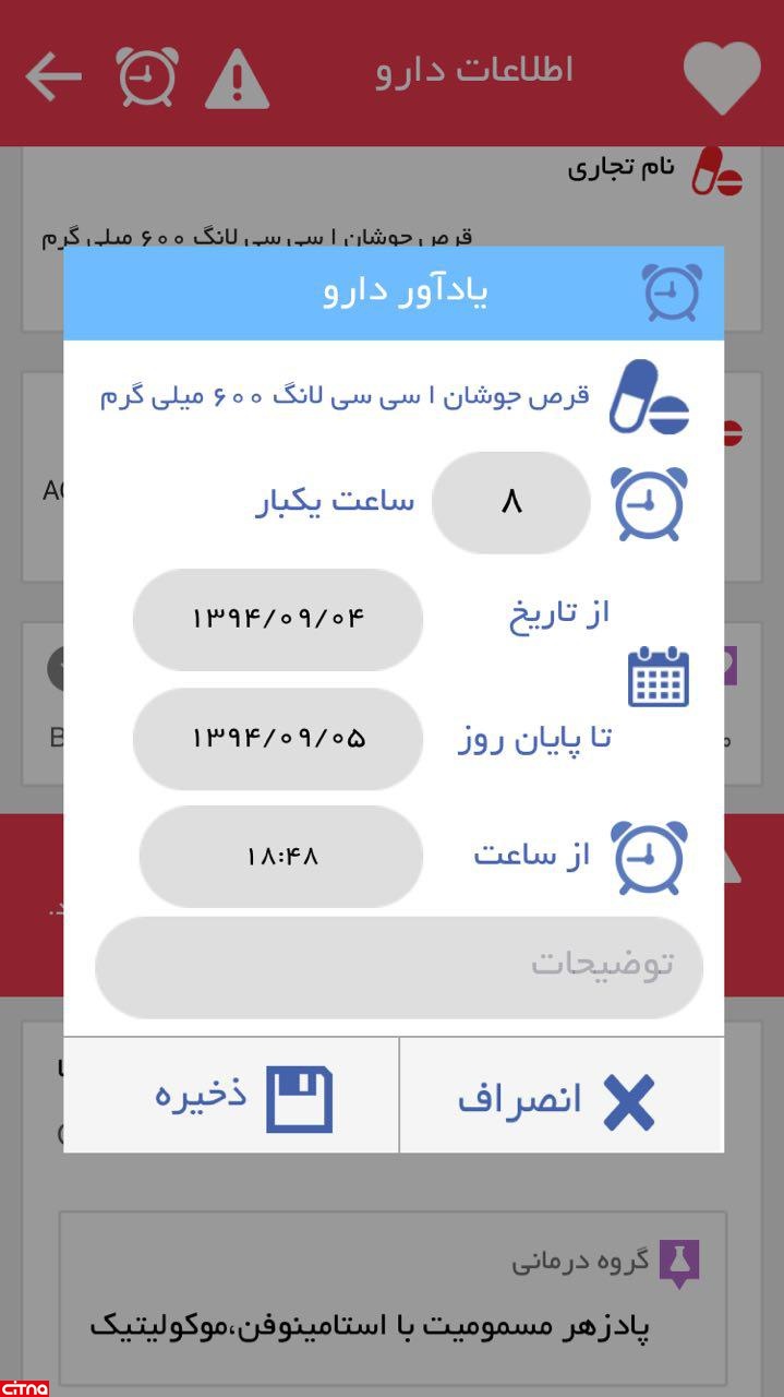 از ویژگی های دیگر این برنامه یادآور مصرف دارو از لحاظ مدت زمان مصرف و تعداد دفعات و ساعات مصرف است.