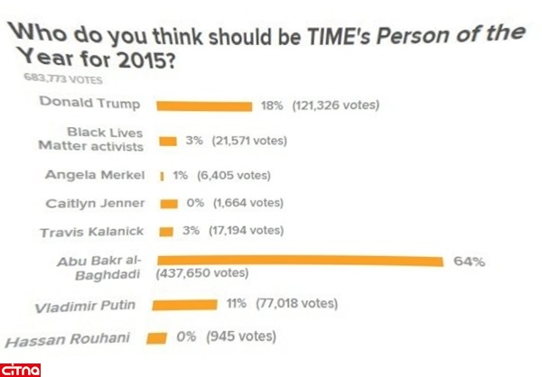 در نظرسنجی های مجازی ابوبکر البغدادی سرکرده گروهک داعش با ۶۴ درصد پیشتاز بود و مرکل تنها یک درصد رای کسب کرد