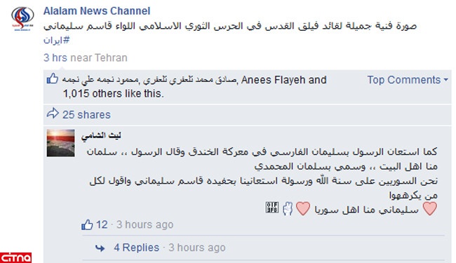 در یکی از نظرات کاربران آمده است: همچنان که رسول خدا (ص) از سلمان فارسی در نبرد خندق کمک گرفت و درباره او فرمود: "سلمان از اهل بیت ماست" و او سلمان محمدی نامیده شد؛ ما نیز به تبعیت از رسول خدا (ص) از نواده سلمان یعنی قاسم سلیمانی کمک گرفتیم و به کسانی که این کار خوش ندارند، می گوییم: "سلیمانی از اهل سوریه است".