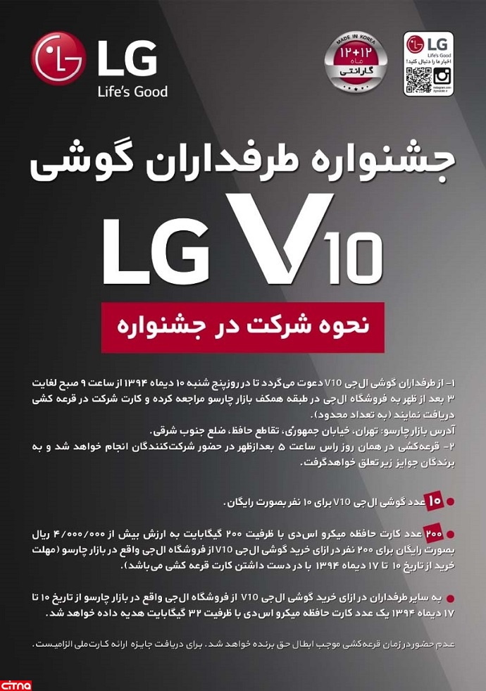 الجی از طرفداران V10 دعوت میکند تا در روز پنجشنبه دهم دی ماه 94 از ساعت 9 صبح الی 3 بعدازظهر به فروشگاه الجی در طبقه همکف بازار چارسو مراجعه کنند و کارت شرکت در قرعهکشی را دریافت نمایند.