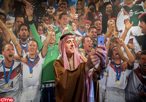 در این تصویر، عادل الجبیر وزیر امور خارجه عربستان سعودی رادر حال سلفی گرفتن در مقابل پوستر بزرگی از تیم ملی فوتبال آلمان می بینید.