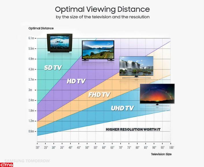 به گزارش سیتنا، تلویزیونهای جدید امروزی با طراحی مدرن دارای امکان پخش محتوای UHD هستند، تصاویری سه بعدی پخش میکنند و حتی برخی تولیدکنندگان مانند سامسونگ، تلویزیونهای SUHD مجهز به اینترنت اشیاء را نیز به بازار معرفی کردهاند. توجه به این امکانات برای انتخاب تلویزیون مناسب، یک روی سکه است. روی دیگر سکه ارزیابی و انتخاب تلویزیونی است که برای قرار گرفتن در فضاهای مختلف، استاندارد باشد. یکی از مهمترین نکات هنگام خرید تلویزیون مناسب، اندازه آن و فاصله دید کاربر با دستگاه است. باید به این نکته توجه کرد که فاصله دید و کیفیت وضوح تلویزیون بهترین اندازه تصویر را مشخص میکند.
