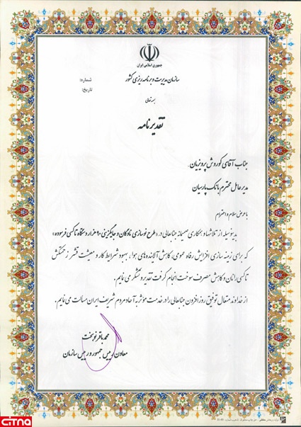 تقدیرمعاون رئیس جمهور و رئیس سازمان مدیریت و برنامه ریزی کشوراز مدیرعامل بانک پارسیان