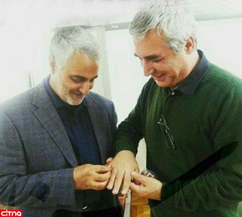 به گزارش سیتنا به نقل از کانال تلگرامی روزنامه سینما، حاج قاسم سلیمانی در این دیدار، انگشتر مدافعان حرم را به حاتمیکیا اهدا کرد.