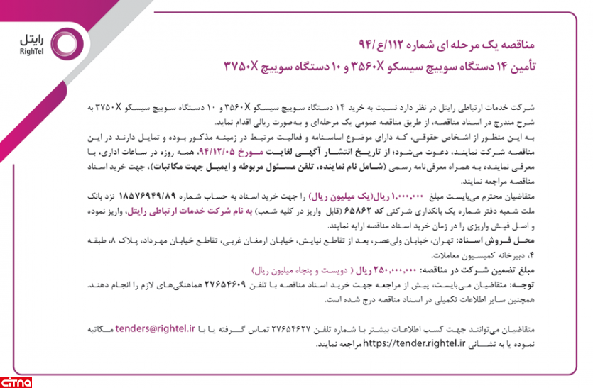 رایتل در نظر دارد نسبت به خرید 14 دستگاه سوییچ سیسکو ×3560 و 10 دستگاه سوییچ ×3750 به شرح مندرج در اسناد مناقصه اقدام کند.