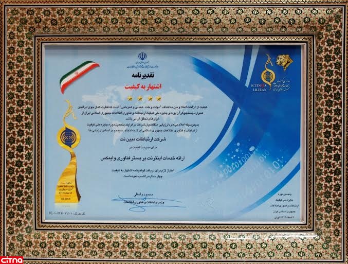 در مراسم اختتامیهی پنجمین دورهی جایزهی ملی کیفیت ارتباطات و فناوری اطلاعات جمهوری اسلامی ایران (ICTINQA) که امروز برگزار شد، شرکت ارتباطات مبیننت موفق به دریافت «جایزهی ملی اشتهار به کیفیت چهار ستاره» شد.