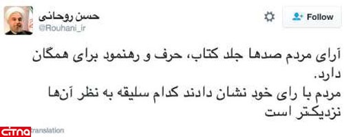 به گزارش سیتنا، حجت الاسلام و المسلمین حسن روحانی در آخرین مطلب خود در توئیتر در مورد انتخابات اخیر تصریح کرد: مردم با رای خود نشان دادند کدام سلیقه به نظر آنها نزدیک تر است.