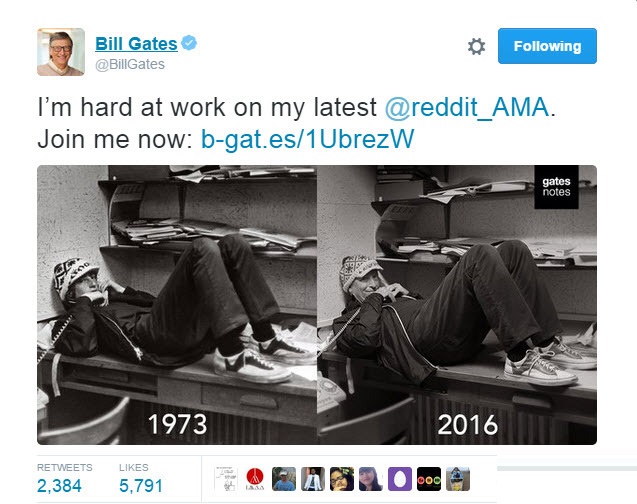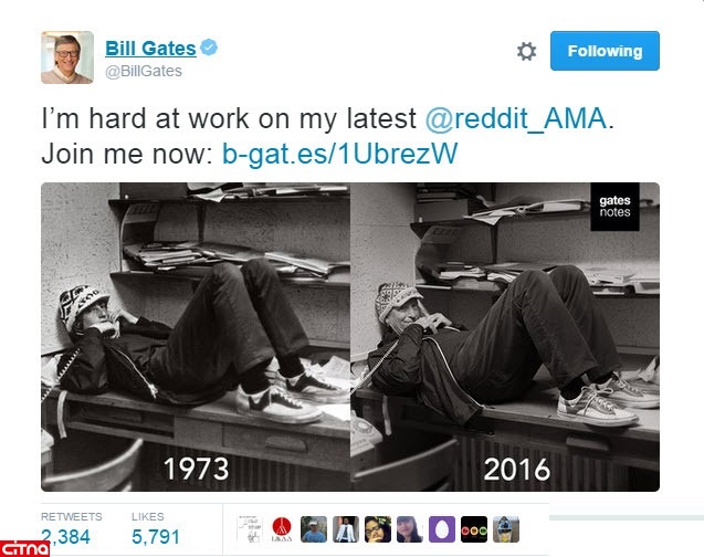 بیل گیتس در صفحه توئیترش عکسی مشابه از خود که با فاصله 43 سال تکرار شد، منتشر کرد.