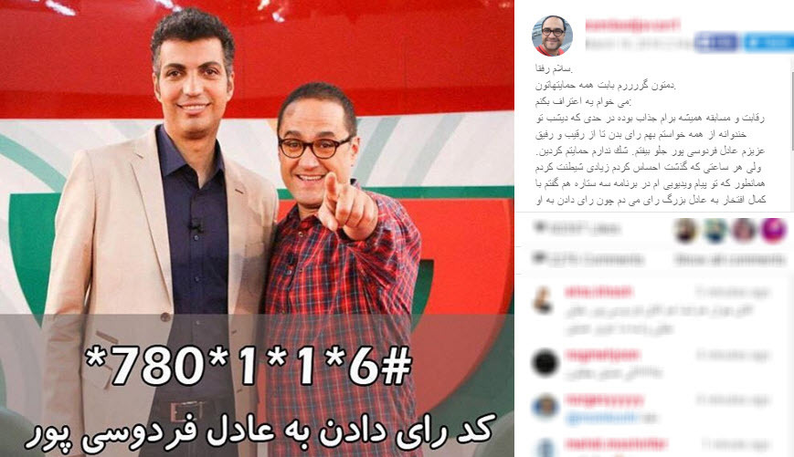 شنیدههای خبرنگار «تابناک»، حکایت از آن دارد که پس از این اقدام رامبد جوان، عادل فردوسی پور با رامبد تماس گرفت و درباره استفاده از فرصت آنتن زنده تلویزیون در این رقابت با ناراحتی گلایه کرد. رامبد جوان نیز برای آنکه جبران کرده باشد، در اینستاگرامش که طبیعتاً تاثیر چندانی در مقابل آنتن زنده تلویزیون ندارد، یک پست گذاشت و از طرفدارانش خواست تا برای فردوسی پور رای جمع کنند.