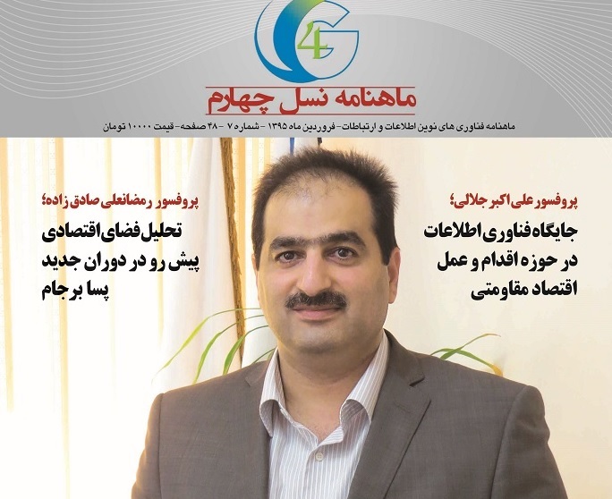 یادداشت ماه این شماره از ماهنامهی نسل چهارم را پروفسور علی اکبر جلالی، معاون پژوهشی دانشکدهی برق دانشگاه علم و صنعت و مدرس اینترنت اشیاء تحت عنوان "جایگاه فناوری اطلاعات در حوزهی اقدام و عمل اقتصاد مقاومتی" نوشته است.