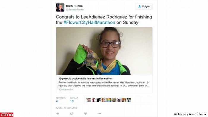 یک دختر نوجوان در غرب نیویورک که روز یکشنبه برای شرکت در یک مسابقه دوی پنج کیلومتری رفته بود به اشتباه به شرکتکنندگان نیمهماراتن پیوست. او توانست مسیر را با موفقیت به انتها برساند و مدال دریافت کند.